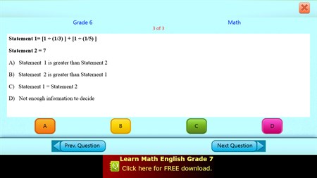 The QVprep Lite grade 6 app has ten practice tests each in quantitative and verbal ability. Each practice test has sample multiple choice questions for you to try out.
