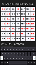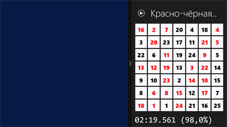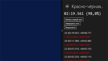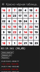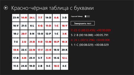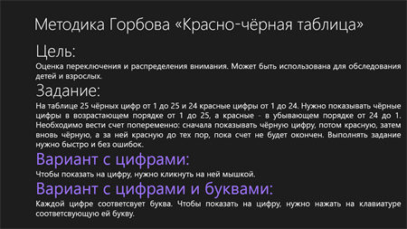 «Красно-чёрная таблица» по методике Ф.Д.Горбова, Л.Д. Чайновой (1959). Была разработана для оценки переключения внимания у космонавтов и лётчиков. Может быть использована для обследования детей и взрослых. Методика разработана для тренировки внимания в условиях возникающих помех (звуковые или световые). В условиях одновременного выполнения двух и большего числа действий исследуется возможность распределения внимания и переключаемость. Для тестирования используется таблица 7 на 7 квадратов. В 49 квадратах размещены цифры черного (от 1 до 25) и красного (от 1 до 24) цветов в случайной комбинации, исключающей возможность запоминания. Требуется непрерывно вести счет черных чисел в возрастающем, а красных в убывающем порядке, чередуя эти действия, и показывая соответственно то черную, то красную цифру в таблице. Выполнять задание нужно быстро и без ошибок. В программе присутствует два вида красно-чёрной таблицы: 1. Красно-чёрная таблица с цифрами. Используется вместе с мышью или сенсорным экраном. 2. Красно-чёрная таблица с цифрами и буквами. Используется вместе с клавиатурой.