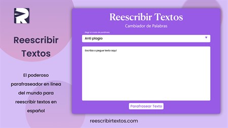 El poderoso parafraseador en línea del mundo para reescribir textos en español Nuestro equipo ha desarrollado reescribir textos en línea exclusivamente para escritores de contenido en español. Es único, avanzado y el mejor parafrasear textos disponible en Internet para reescribir texto.
