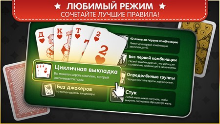НАСТОЯЩАЯ РАММИ – Используйте оригинальные карты рамми или особые карты с повышенной удобочитаемостью. – Множество колод: французская, турнирная, немецкая... – Играйте по особым правилам: «Стук», «40 очков за первую комбинацию», «Малая колода» и другим. – Играйте по собственным правилам.