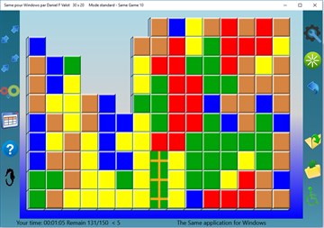 Это уединенная игра. Чтобы играть то же самое, вам нужно удалить большую часть фрагментов по зонам. Зоны выполнены из соседних одинаковых плиток. Вы можете выбрать различные уровни игры (3, 4 или пять цветов). Вы можете выбрать другой размер платы в меню «Настройка». Базовая оценка отображается в строке состояния. Он увеличивается на величину размера зоны. Учитывается только зона над двумя плитами. Вы должны взять большую зону, чтобы получить хороший результат. Игра быстро увеличивает конечный результат. Игра с четырьмя или пятью цветами увеличивает счет. Лучшие игроки - это те, кто решает совет за меньшее время, чем другие, принимая большие зоны с большим количеством цветов. Это классическая игра Same с возможностями отмены / повтора. поддержка на семнадцати языках (немецкий (Германия), английский (США), арабский (Саудовская Аравия), Бангладеш (Бангладеш), Китайский (Китай), испанский (Испания), французский), хинди (Индия), венгерский (Венгрия) , Италия (Италия), японский (Япония), малайский, голландский (Нидерланды), норвежский (bokmål) (Норвегия), португальский (Португалия), русский (Россия), шведский (Швеция)) Инвалиды поддерживают клавиатуру.