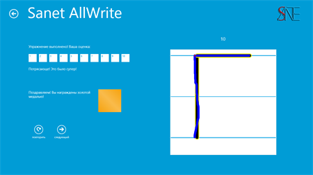 Интерактивная программа Sanet Allwrite - это электронная пропись, которая: - развивает мелкую моторику, память, обучает письму (цифры, русские, английские буквы, китайские иероглифы и различные символы); - позволяет в современной форме овладеть основами графического письма, привить ребенку тягу к знаниям; - основана на соревновательном методе в обучении и заинтересует не только детей, но и взрослых. Sanet Allwrite делает процесс обучения увлекательным и легким! Изучение символа в Sanet Allwrite разделено на три этапа: - Обучение: при помощи анимации показано, как и в каком порядке следует писать символ. - Практика: пишем символ по его контуру на экране устройства. - Контроль: необходимо написать символ на экране устройства без каких-либо подсказок. Программа проверяет правильность и аккуратность выполнения задания и выставляет отметку по 10-бальной шкале и награждает медалью – бронзовой, серебряной или золотой! Допущенные ошибки помечаются, что позволяет улучшить проблемные места при повторном выполнении задания.