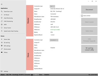 SmartBug2 application controls the new MD-45686-S multi-sensor wireless module from TDK InvenSense via BLE, USB or WiFi link. It can collect raw sensor data and run various motion algorithms including Spatial Audio head tracking, sensor fusion, APEX, air mouse, asset monitoring etc.