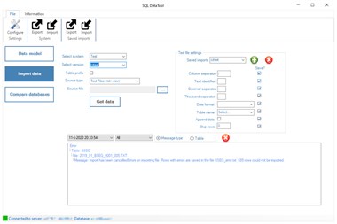 Easily import data... without errors Have you ever had issues while importing data into a database? One record with an error breaks your data load, and the source table remains empty. SQL DataTool allows you to solve errors when importing data. Records with errors are written away in an error-file, without breaking the import. You can then solve these errors and append the data to the already imported table.