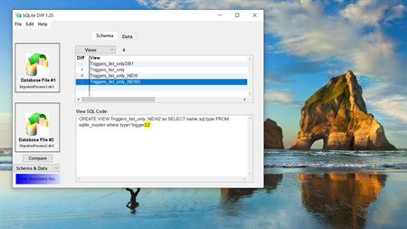 SQLite Diff is a graphical comparison tool for SQLite database files, comparing both the schema and the data. Schema results include comparisons of tables/columns, triggers, indexes and views. Changed SQL code including trigger SQL, index creation SQL, view creation SQL code and changed data records are displayed with yellow highlighting to make it easier to see the differences between the compared files.