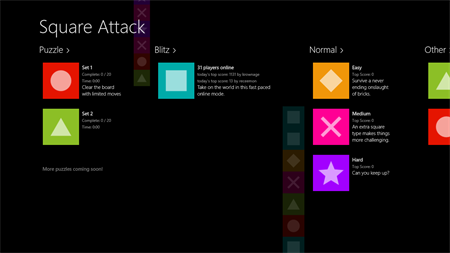Prepare for the most challenging puzzle game for Windows 8! Square Attack features 3 intense game modes. Solve 40 difficult levels in Puzzle Mode. Survive as long as you can in Endless Mode. Play online against your friends on Windows 8 and Windows Phone in the fast paced Blitz Mode. Join the attack now!
