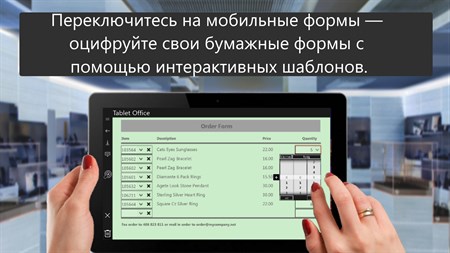 Tablet Office использует определяемые пользователем интерактивные шаблоны для повторяющихся отчетов и протоколов. Он поддерживает накладные о доставке, счета-фактуры, отчеты об обслуживании, отчеты о состоянии, журналы, отчеты об ошибках, простые заметки и другие. Это также полезно для сбора данных и обмена ими с сотрудниками и архивирования. Отчеты могут быть собраны путем объединения различных шаблонов.