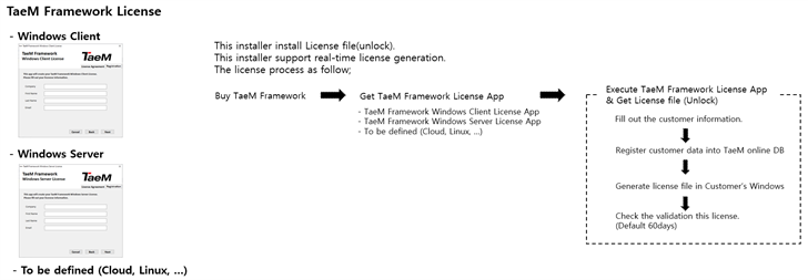 TaeM Framework Trial include as follows. - Components : .NET Framework dll component can be used in Visual Studio, GAC and so on. : supports .NET Framework 2.0, 4.0, 4.5, 4.7. - User guides : TaeM Framework User Guide (English)