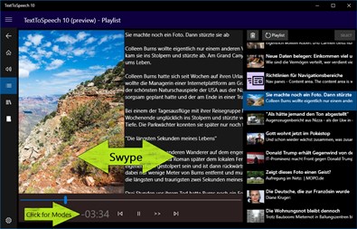 - Send URLs with EDGE or MSN News or some other App which can share URLs (Web-Links). - The App will download & exract the whole Text in most cases. - TextToSpeech 10 will read aloud your pages / Playlists of pages, >> create Playlists. - Background Audio Play! Will continue to play on LockScreen. - I developed a Rich Audio Player for Background. As fine as with a Media Player in Foreground :) - WebSites (Texts) will be saved in a Library (future: organize in categories). - Import RSS-Feeds (Ultra AlphaVersion .. not ready at v1.0). - PREMIUM: PDF Import!! (In development, the core feature is already working & stable)