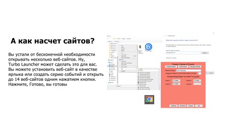 - Он позволяет создавать серию событий, например, скажем, вы используете Word, Excel, Chrome, калькулятор, календарь, PowerPoint, Skype и несколько веб-сайтов. Открытие всех этих приложений и веб-страниц может занять некоторое время. Вот где вступает Turbo Launcher, он автоматизирует этот процесс для вас. Вы можете создать горячую клавишу и увидеть, как все эти приложения и веб-сайты открываются для себя.