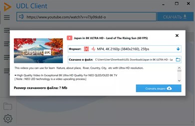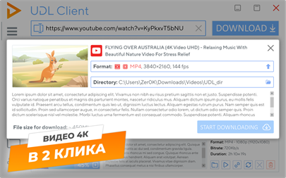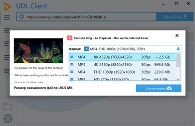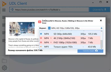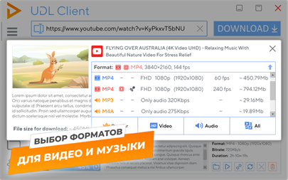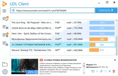 Утилита позволяет скачать видео с YouTube в mp4 нужного качества. Помимо «стандартного» набора форматов 360p, 480p и 720p HD для многих видео доступны варианты с повышенным качеством: 1080p Full HD, 4K Ultra HD и другие. Более того, UDL Client — ещё и программа для скачивания аудио в mp3 с Ютуба. У ЮДЛ продуманный и минималистичный интерфейс, высокое быстродействие и она доступна абсолютно бесплатно.