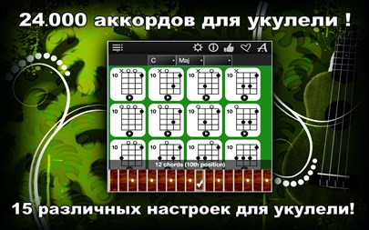 UkuleleChordsCompass влючает в себя: - Число аккордов: 24.000. - Уникальная возможность прослушивать каждый аккорд на экране. - С помощью Drag&Drop Вы сможете перенести нужные Вам аккорды и сохранить их в своих музыкальных сборниках. - Поддержка 56 типов аккордов: Maj, Maj 6, Maj 7, Maj 9, Maj 11, Maj 13, Maj Maj7, Maj Add9, Min, Min 6, Min 7, Min 9, Min 11, Min 13, Min Maj7, Min Add9, Dim, Dim 6, Dim 7, Dim 9, Dim 11, Dim 13, Dim Maj7, Dim Add9, Aug, Aug 6, Aug 7, Aug 9, Aug 11, Aug 13, Aug Maj7, Aug Add9, Sus2, Sus2 6, Sus2 7, Sus2 9, Sus2 11, Sus2 13, Sus2 Maj7, Sus2 Add9, Sus4, Sus4 6, Sus4 7, Sus4 9, Sus4 11, Sus4 13, Sus4 Maj7, Sus4 Add9, 5, 5 6, 5 7, 5 9, 5 11, 5 13, 5 Maj7, 5 Add9, - Звук настоящей укулеле. - Приложение поддерживает все распространённые виды настройки гавайской укулеле: 1. Soprano Standard, 2. Soprano C, 3. Sopranino Standard, 4. Sopranino New, 5. Tenor Low G, 6. Tenor New, 7. Baritone Standard, 8. Baritone Canadian, 9. Open A, 10. Open B, 11. Open C, 12. Open D, 13. Open E, 14. Open F, 15. Open G, - Поддержка для левшей. - Регулируемая громкость.