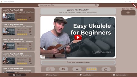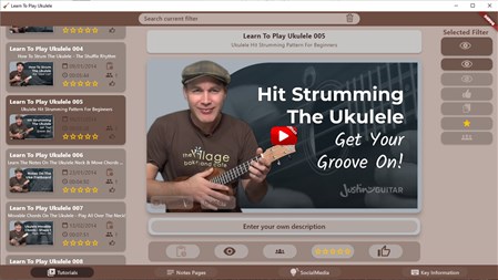 Learn to play Ukulele is a app with over 230 Video Tutorials, Guides and Demos and much more. Ensure that you have the freely available VCRUNTIME software installed to ensure smooth running of the app. The Ukulele is a fun and relatively cheap instrument and it can give you a lifetime of fun. The app is designed to make your learning as fun and as easy as possible. You will start with the basics and end up learning how to play hundreds of your favourite songs! The app has many exciting features to help you learn your new skills as easily and as quickly as possible! Each video tutorial is user interactive and you can add your own meaningful user description - this automatically becomes searchable - so finding specific tutorials you wish to revisit is as easy and as quick as possible. You can also add a rating and make any video one of your favourites. One really useful feature is the Clipboard filter that can be added to selected tutorials so that they immediately show up when the Work in progress filter is selected. The app has a self contained user notes module where you can maintain your own personal set of user notes and even set up links to web pages. There is also a self contained Social Media module which allows you to set up various one touch links to your favourite social media sites, or forums, or user groups. Learn how to play all your favourite songs with ease!