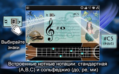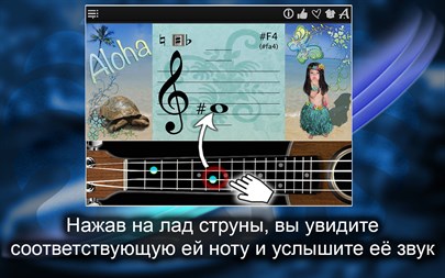 “Навигатор” позволяет найти музыкальные ноты на укулеле в интерактивной форме! Когда Вы укажете ноту на виртуальном листке, app покажет, где находится нужные лады и струны для этой ноты и, наоборот, нажав на лад и струну укулеле, Вы увидите соответствующую ей ноту на листке и услышите ее звук.