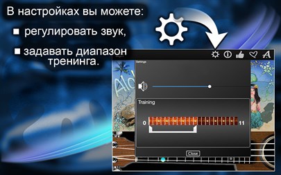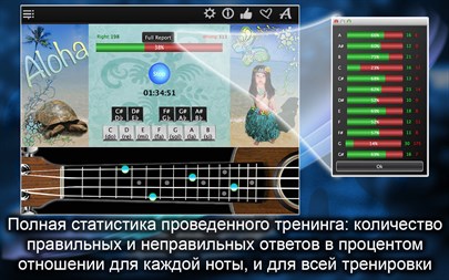 "Тренер" предлагает Вам отгадывать ноты показывая вам нажатые струны на ладах и предоставляет полную статистику, чтобы показать, где вы делаете ошибки. Благодаря этому вы можете оценить ваш прогресс обучения и видеть когда вы достигаете лучших результатов.