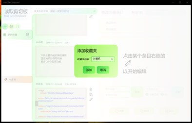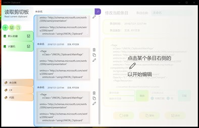 一个剪贴板保存和条目管理程序(Beta)。 For clipboard data management(Beta). 目前是测试版本,UI和出错处理均不完全。 Beta Version for test. UI and exception handling are not robust. 目前支持文本和RTF富文本的保存和部分编辑功能。 Support txt and rtf so far, and some editing functions。 收藏夹管理,标签分类,条目名称搜索。 Saved in collections, classified by tags, searched by entry's names. 目前版本不稳定,后续Release版本会继续改进。 current version is unstable, many things will be improved in a later release.