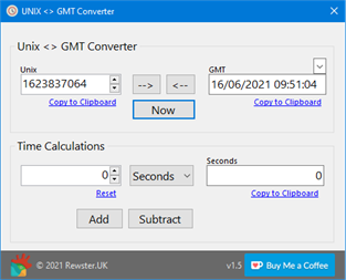 Easily convert dates to Unix time and back, also add/subtract time units. Unix <> GMT Converter is always available in the notification area until closed.