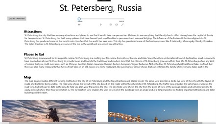 This app is designed to help the average tourist get around the wonderful city of St. Petersburg and explore the city and all that it offers. This app lists the top points of interest and the top restaurants and shows where they are on our convenient map that can be configured to your liking.