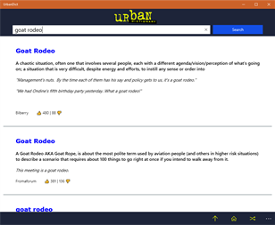 Universal Windows App for Urban Dictionary (Unofficial), and this is NOT a web crawler. Simple, nice, fast, and no-ads!