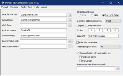 VBA Compiler for Excel is VBA protection software which converts the VBA code of Microsoft Excel workbooks and Excel add-ins into the binary code of a native Windows DLL file. After compilation, your VBA code cannot be copied or recovered and has the highest level of protection from piracy. VBA Compiler is the best alternative to the usual VBA code protection approaches, such as VBA code obfuscation, VBA unviewable and standard MS Excel VBA project password protection. The compiled workbook or Excel add-in file is left with the original file extension and behaves the same way as the original file. The trial version of VBA Compiler for Excel has the following limitations: - The trial version nag window appears on startup - A workbook with compiled VBA code expires after 3 days - Commercial usage of the workbook with compiled VBA code is not allowed - The feature of setting the compiled DLL file version and copyright is not available - The feature of command line compilation is not available - The feature "Make VBA unviewable" is not available - The feature of compilation for "Both 32 & 64 bit" Excel is not available -The feature of compiling VBA code copy protection with activation/registration key is not available - The feature of compilation as a trial/demo version of the workbook is not available - The feature of a set alternative path to a compiled VBA code DLL file is not available - The feature of customization/translation of run-time messages is not available