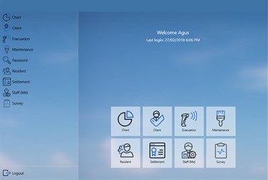 Available features on mobile app are Chart, Client, Resident, Staff, Evacuation, Maintenance, Survey and Settlement functions.