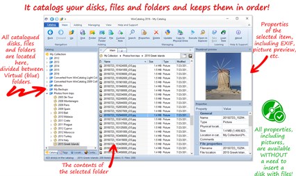 The main goal of WinCatalog is to organize your catalog of files, using virtual folders, tags (categories) and any user defined fields, and find files in seconds, using powerful search, including search for duplicate files.