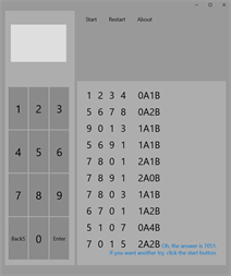 这是一个经典的有趣的数学谜题小游戏1A2B的UWP移植版。 在游戏开始时应用程序生成一个长度为4没有重复数字的一个数字。玩家每次提交另一个四位数时应用程序会给出一个判断结果包含 有多少个数字猜对了但是位置没猜对 和 有多少个数字猜对了并且位置也猜对 。 你能在10次尝试之内解决这个问题吗?