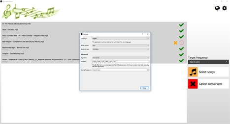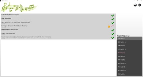 ## Features: - Convert songs from standard tuning (440 Hz and other tunings) to 432 Hertz, 174 Hertz, 285 Hertz, 396 Hertz, 417 Hertz, 440 Hertz, 528 Hertz, 639 Hertz, 741 Hertz, 852 Hertz, 963 Hertz. - Support for many audio input formats (including the audio stream of videos). - Support for multiple audio output formats such as mp3, m4a (aac), flac, and wav with up to 512 kBit/s. - Convert multiple files or your whole music collection with the built-in batch conversion capability. - Easy to use interface: drag file(s) into app and click "Convert" or select a folder and convert all files in it. - Multi-threading: multiple files are converted in parallel.