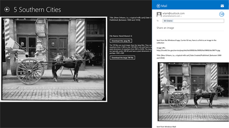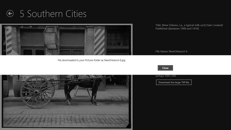 Tap a photo thumbnail to see a larger image accompanied by a description and a button to download the jpeg file or a larger tiff file. While viewing the image if you bring up the share charm, you will be able to share the photo via email. To view a slide show (manual, not automatic) while on the main page, simply tap the 'Slide Show' button. While viewing the slide show, you, again, may bring up the Share Charm to share an image via email. To search the entire collection for a word or a phrase (not a collection of words), simply bring up the Search Charm or if on the main screen tap the Search button. The collection is a view of these cities 40 or so years following the Civil War which was so disastrous to the region. There is also a sister Windows Phone 8.1 app.