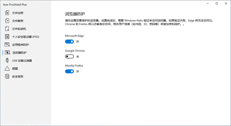 浏览器防护 您可将浏览器设置为受保护。设置完成后,需要 Windows Hello 验证来访问浏览器。如果验证失败,Edge 将无法访问它。Chrome 和 Firefox 将以访客身份访问,这意味着相关用户信息(如书签、ID、密码等)将被加密和保护。