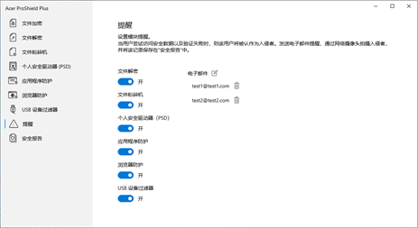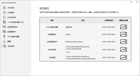 Acer ProShield Plus 包含用于保护设备免受未经授权的访问和入侵的模块。 ● 文件加密 ● 文件粉碎机 ● 个人安全驱动器(PSD) ● 应用程序防护 ● Browser Guard ● USB Device Filter