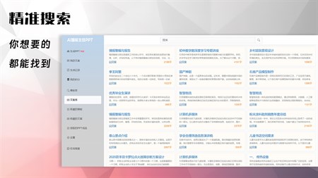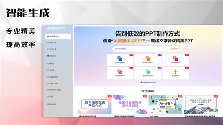 AI智能生成PPT是一款实用类 PPT 制作工具,它可以帮助您快速制作出专业、精美的PPT演示文稿,提高效率。为广大用户提供了丰富的PPT文案资源和模板资源,将为您带来极大的便利,是制作 PPT模板 的好帮手。 产品特色: 【海量素材库】拥有海量的优质素材库,涵盖各种主题、风格和行业,让您轻松找到所需,提升PPT制作效率。 【AI生成PPT】自带一键生成PPT功能,输入自己感兴趣的题目内容就可以生成对应的PPT,为您提供创作灵感。 【多种类文件转PPT】支持Word文件、Markdown文件、PDF文件、图片、网页内容转 Powerpoint 文档,仅需3-50秒即可转换完成。 【实时更新】素材库定期更新,让您时刻紧跟潮流,制作出最具时尚感的PPT。
