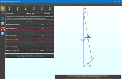 It also contains an example generator for the 15 different cases of 4 given values with 2 to calculate. Occasionally it also produces "impossible" values, such as triangles degenerated to a single line or data for which it is not possible to construct a wind triangle. This is deliberate to let a (student) pilot think about the data entered and find good data starting from there.