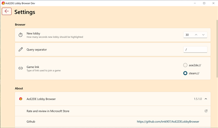 Lobby browser for Age of Empires II: DE - Filter games by game type, map type, speed - Show notifications for new games - Join game directy from lobby browser - List players in lobby - Add players to your friends list. See what lobby they are waiting in and quickly join the same game - Copy link to game - Auto refresh