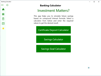App has 3 calculators - Certificate of Deposit, Savings and Savings Goal calculator that is commonly used to evaluate financial investment .