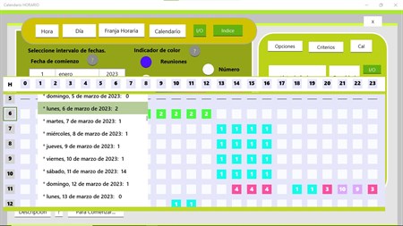 Calendario horario. Esta aplicación es el complemento para las aplicaciones Consultas(Queries) y Agenda Permite hacer consultas de las reuniones del calendario de Windows En función de la hora del día. Genera una grilla de 24 horas(columnas) y de la cantidad de días que establece en el rango de criterios(filas). Una vez que genera la grilla puede indicar visualizar día completo en el calendario Determinada hora que usted marque O entre las 2 fechas que indique, Una horario determinado Así puede ver un día en el calendario de Windows Y también la lista de reuniones Entre rangos y horario.