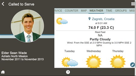 II. Follow Your Missionary Service Called to Serve is the ultimate LDS missionary tracker! This powerful app gives the friends and families of LDS missionaries – quick and easy access their missionary's profile, picture, departure date, return date, location details and mission information. Track as many missionaries as you like. See how long they've been gone and how much time they have left including their departure date, return date, days served, days remaining and percent complete. Everything including the current time, temperature, weather and weather forecast information.