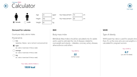 Calories PRO! is a base of over 2220 products divided into various categories and subcategories. Each product contains a photo and information about the amount of calories and nutritional value. Application allows you to compose meals to determine their calorific value and offers a set of calculators (ex. BMI, calorie requirements and others) regarding sex, weight, height and age of user. Note! An internet connection is not required!