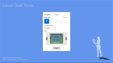 Features: • Match type : Women's singles, 1 set (best of 3, 7 or 11 games) match. • 3 court types: You have a choice of clay, hard or grass court. • 5 difficulty levels: From easy Level1 to expert Level5.