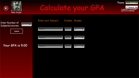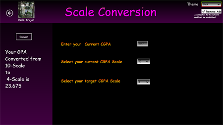 Want to know how this app works ?? Here is the description of the pages: * GPA: Calculate your Grading Point Average and the app saves your last selections and thus you don't have to give the information each time. *SGPA: Calculate your GPA of every semester and find your CGPA in the Profile Page. Note: You must first fill your Info in Profile page to access this page. *Scale Conversion: Convert your GPA from one scale to another. *Profile: Keep your info and have track of your CGPA. This page also includes the following functionality : # Enter your Info: This is for first-time users, who need to fill up their info to widely use this app. # Update Your Info: If you want to update your Info, you can do it here. # Know your Status: Track down your SGPA at a single page. # Delete Your Info: Deletes everything (Your info, GPA Record, SGPA), resets themes # Keep track of the History: The selections made by you in GPA page is kept for better user-experience. However your can shut-it-down. *About: Know about CGPA, functionality, features, author of this app and Privacy Policy.
