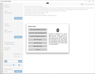 In Bridge mode, this application enables communication between different types of communication technologies. PC with this application acts as a middleman device. It connects to remote devices which cannot communicate directly, and it creates communication bridge between them, enabling them to exchange data.