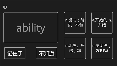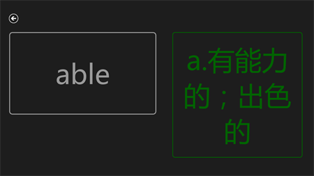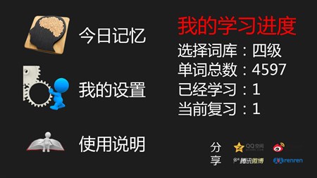 Cool词酷,酷酷的背单词! Cool词酷带有新颖的记忆曲线功能,根据对每个人对单词的熟悉程度,对不熟悉的单词反复出现记忆,对熟悉的单词则避免反复重复,达到高效率的记忆单词的目的。 使用时只需要点击单词的正确意思,软件会自动就算记忆单词的情况并根据点击意思的正确与否增加或减少出现频率。如果已经熟记某些单词,则点击 “记熟了”,该单词就不会在出现。 界面简洁,功能强大,随身可记忆单词,是您记忆单词的好帮手! 目前提供四六级和部分国外考试词库供选择。另有Windows Phone版本,随时随地记单词! Cool词酷,原来背单词可以这么酷!
