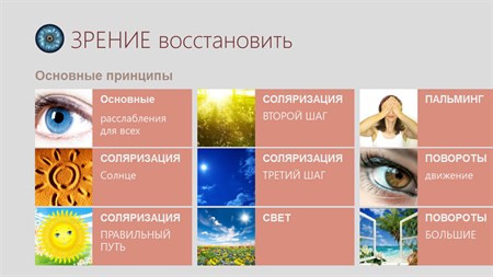 В приложение – метод по восстановлению зрения доктора Уильяма Г. Бейтса, знаменитого офтальмолога. Приложение потребует от вас ежедневного выполнения рекомендаций и упражнений ( не займет много времени, но необходима регулярность). Если вы не готовы к ежедневной работе – не тратьте деньги ( приложение платное). Если вы будете решительны и точны в своих занятиях - вы добьетесь одинаково хороших психического и зрительного контролей. Будьте терпеливы и упорны, и хорошие результаты – в ваших руках! Природа отдает, не торопясь, и строит постепенно. Любое стоящее дело требует соответствующей работы и терпения. И тогда вы тоже сможете улучшить свое зрение.