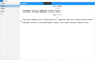 DPX衍生自东北大学Universal Visual Programming课程的学生作品DailyPeotry。DPX具备每日诗词推荐、诗词搜索、收藏、OneDrive收藏同步等功能。