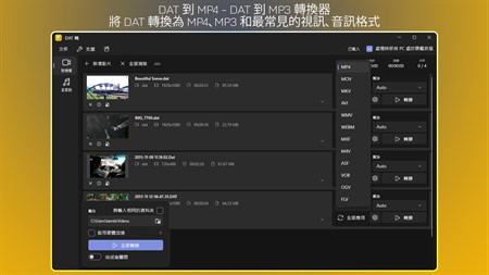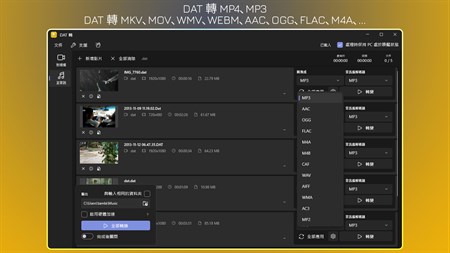 將 DAT 轉換為 MP4 和更多輸出格式:MOV、MKV、AVI、WMV、WEBM、MXF、M4V、ASF、OGV、FLV。 將 DAT 轉換為 MP3 和更多輸出格式:AAC、OGG、FLAC、M4A、M4B、CAF、WAV、AIFF、WMA、AC3、MP2。