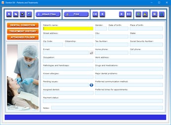 You can store your patients' data in detail, indicating, of each one, the name, gender, date and place of birth, home address, citizenship, Tax Number, Social Security Number, e-mail address, home and cell phone numbers, occupation, work address, pathologies and handicaps, drugs and medications, known allergies, major dental problems, preferred method to be contacted, assigned dentist, preferred times for appointments, payment status and any further notes.