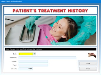 After saving the record, pressing the Treatment History button gives you access to a window where you can list and print all payments made by the patient to your dental office for the services received. To add a dental service to the list, just press the Add treatment button, fill in the text fields in the window that appears, press Save and then Close. For each dental service you must indicate the date, the type of treatment, the name of the dentist performing the service, the place where the service was provided, and the amount paid.