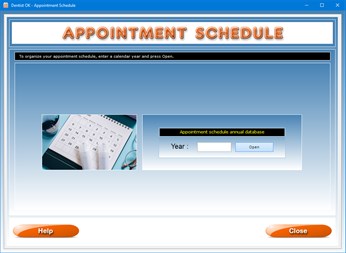 The Appointment Schedule app allows you to monitor deadlines regarding the dental appointments you have made with your patients and to be notified when the date arrives through the use of reports and reminders. The deadlines you can manage could concern any type of dental service you have agreed to provide to your patients, such as teeth cleanings, root canal therapy, tooth extractions, and so on. To use this app you need to create a new annual database of scheduled appointments or open an annual database that you have already created. So, the first operation you need to perform is to select the calendar year of interest and press the Open button.
