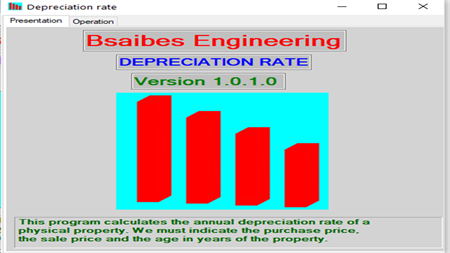 This program calculates the annual depreciation rate of a physical property. We must indicate the purchase price, the sale price and the age in years of the property.