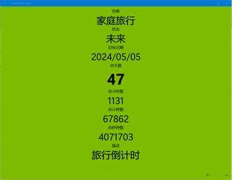 可以计算过去或未来事件的距离天数,以及距离节日、特定日期、纪念日等日期还相差多少天数。 自动统计与过去或未来的总天数、总小数数、总分钟数、总秒钟数。 支持为每个倒数日添加无限制数量的笔记。